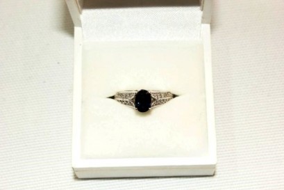 to incl. 1 central blue/black oval sapphire in claw mount, supported with 20 single cut shoulder diamonds. Approx. diamond weight = .10pts. Dimensions of sapphire = 7 x 5mm, Ring size = M -
