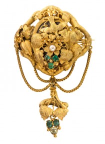 Of vine and grape design, the front embellished with mixed-cut emeralds and a pearl hinged to reveal a portrait, supporting a chain swag suspending a foliate motif terminating in an emerald and diamond swing drop. -