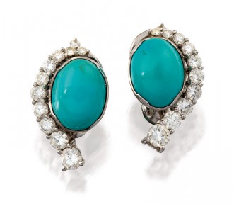 Each oval-shaped turquoise is accented by a line of graduated round brilliant-cut diamonds, the diamonds together weighing approximately 1.90 carats, mounted in 18ct white gold and 14ct gold, length approximately 23mm, post and omega clip fittings. -
