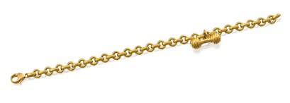 Designed as a line of alternating oval and circular links suspending a charm modelled as dumbbell the terminals embellished with a brilliant-cut diamond, length approximately 180mm, signed T & Co. for Tiffany & Co. -
