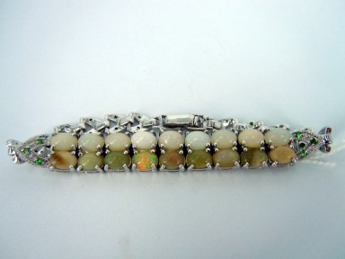Lot #546 - A Silver Bracelet Set With A Double Row of Oval Light Opals And Garnet Highlights