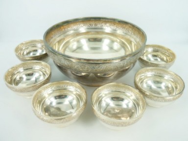 one larger bowl and six smaller bowls each with repoussé embossed foliate band. Total weight: 1140g. -