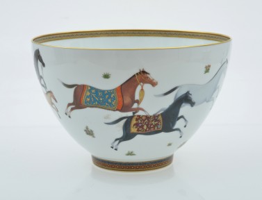 The porcelain bowl with 'cheval d'orient' design in multi colours, with a gilt border. -