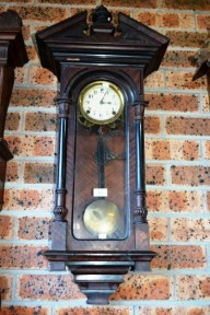 regulator style, comes complete with key and pendulum, minor veneer loss -