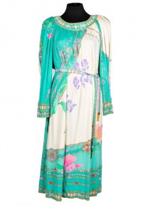 coloured in cream, green and turquoise, with long sleeves, with matching fabric belt, labelled Leonard made in Paris (2) -