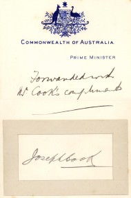 nice signature on piece, affixed to "Commonwealth of Australia, Prime Minister" notepaper with message "Forwarded with Mr. Cook's compliments". -