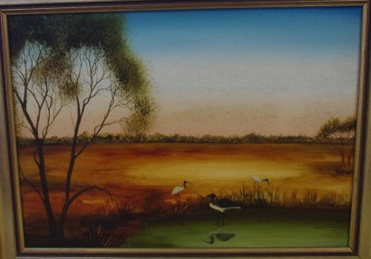 "Ibis at dawn", signed lower right, 32cm x 44cm -