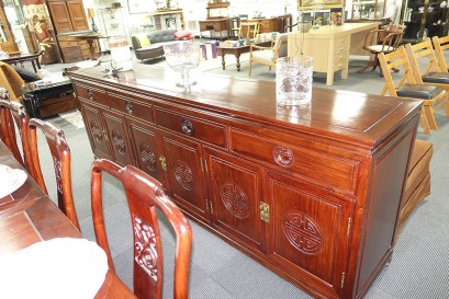 with four drawers and four emblem carved doors, brass escutcheons and fittings, 244 x 87 x 48 cm -