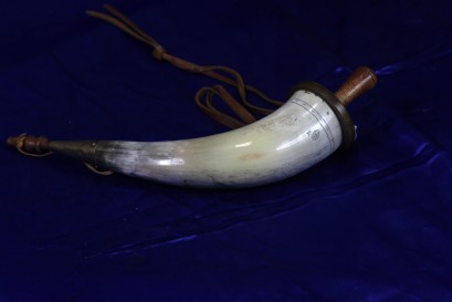 Depicting A Typical Whaling Scene Etched To One Side, Brass Tip To Horn And Carved Wooden Base And Stopper, Complete With Leather Shoulder Loop. -