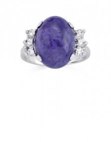 Centrally set with an oval tanzanite cut en cabochon, weighing 13.52cts, flanked by three round brilliant cut diamonds to either side, in 18ct white gold, ring size N-O. -