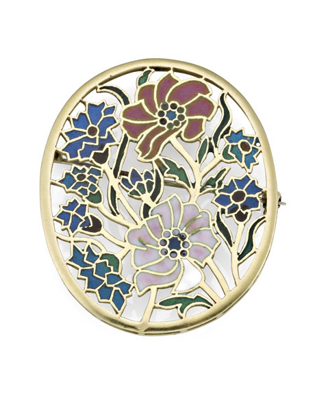 The oval brooch set with floral motifs with fine coloured enamel detail, in 18ct gold, with original fitted box. -