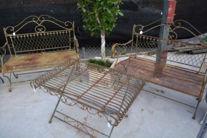 comprising of 2 x 2 seaters and table, nice verdigree patinated finish to all 3 pieces -