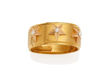 three applied pearl set star motifs to the front section. French assay marks for 18ct yellow gold.