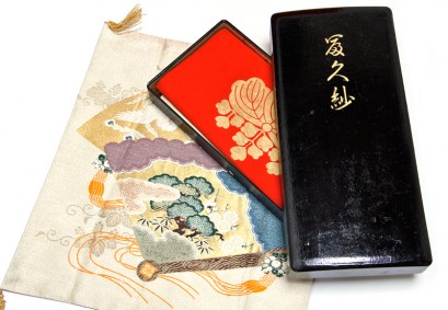containing a gold embroidered fukusa, verso a gold embroidered mon The lacquer box 58.5 x 26.5cm