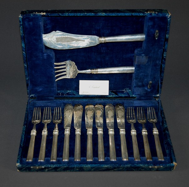 Serving for 6. Textured handles with fish decorated blades, also 2 servers. Incl. early 20th C Shanghai gift card. -