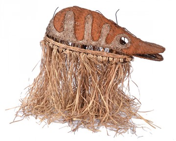 plaited rattan, raphia skirt, open eyes, the mouth a duck’s bill, with skirt 76 x 58cm -