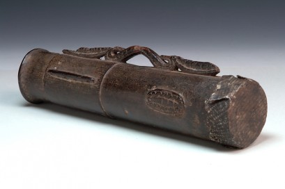 including Trobriand island finger drum, Solomon islands food vessel and two stone pounders. The drum 27.5 cm high -