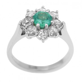 Centrally set with a round cut emerald of 0.45cts, surrounded by eight rose cut diamonds totalling 0.71cts, mounted in 18ct white gold, ring size K. -