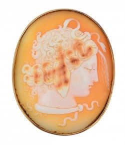 The finely carved oval shell cameo depicting Medusa, mounted in a 9ct gold frame. -