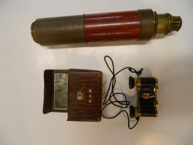 Lot Description:Crocodile skin cased pair of Zeiss binoculars Brass telescope