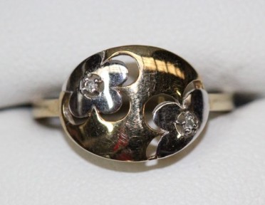 with 2 floral motifs in white gold set with small diamond to centre, on a yellow gold band, ring size N -
