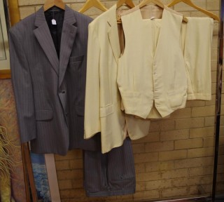 in pale grey together with a buttermilk linen suit consisting of jacket, waistcoat, and 2 trousers, (6) -