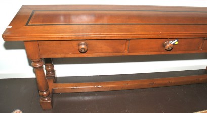 The rectangular top with a central ebonised band above three frieze drawers, raised on turned supports united by cross stretchers, 213 x 81 x 46cm. -