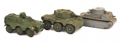 Pre-War Dinky 22F Army Tank; Dinky 676 Armoured Personnal Carrier; And 906 Saladin Armoured Car, All Unboxed (F-G) (3) -