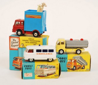 460 Neville Cement Tipper Body On E.R.F. Chassis, Yellow Cab And Chassis, Silver Tank With Red Roof Caps; 463 Commer Ambulance, White With Red Interior; And 503 Circus Giraffe Transporter With Giraffes (VG-E Boxes G-E) (3)