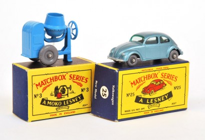 25 Volkswagen, Metallic Light Blue, Grey Plastic Tyres, Green Tint Windows, In C Type Box; And 3 Cement Mixer, Blue In B2 Type Box (E-M Boxes VG) (2) -