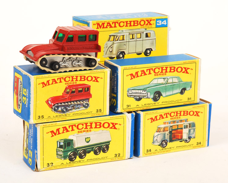 31 Lincoln Continental; 32 Leyland Petrol Tanker, Silver Grille; 34 Volswagen Camper With Raised Roof; 34 Volkswagen Camper; And 35 Snow-Trac (VG-M Boxes F-G) (5)