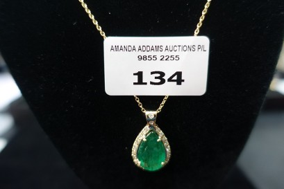featuring pear cut natural emerald 5.25 ct weight, included clarity, dark green colour, |23 round brilliant cut diamonds, grain and bezel set, 0.30 ct total combined weight, VS clarity, colour G. Insurance valuation 17-406-2015 for $19,120 -