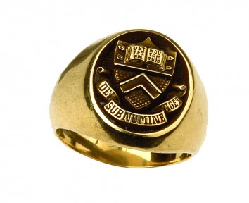 the oval top with university armorial including a shield above a ribbon, motto included, wide flared shoulders, ‘John Roberts’, makers and gold marks stamped to interior band. 18.7gms. -