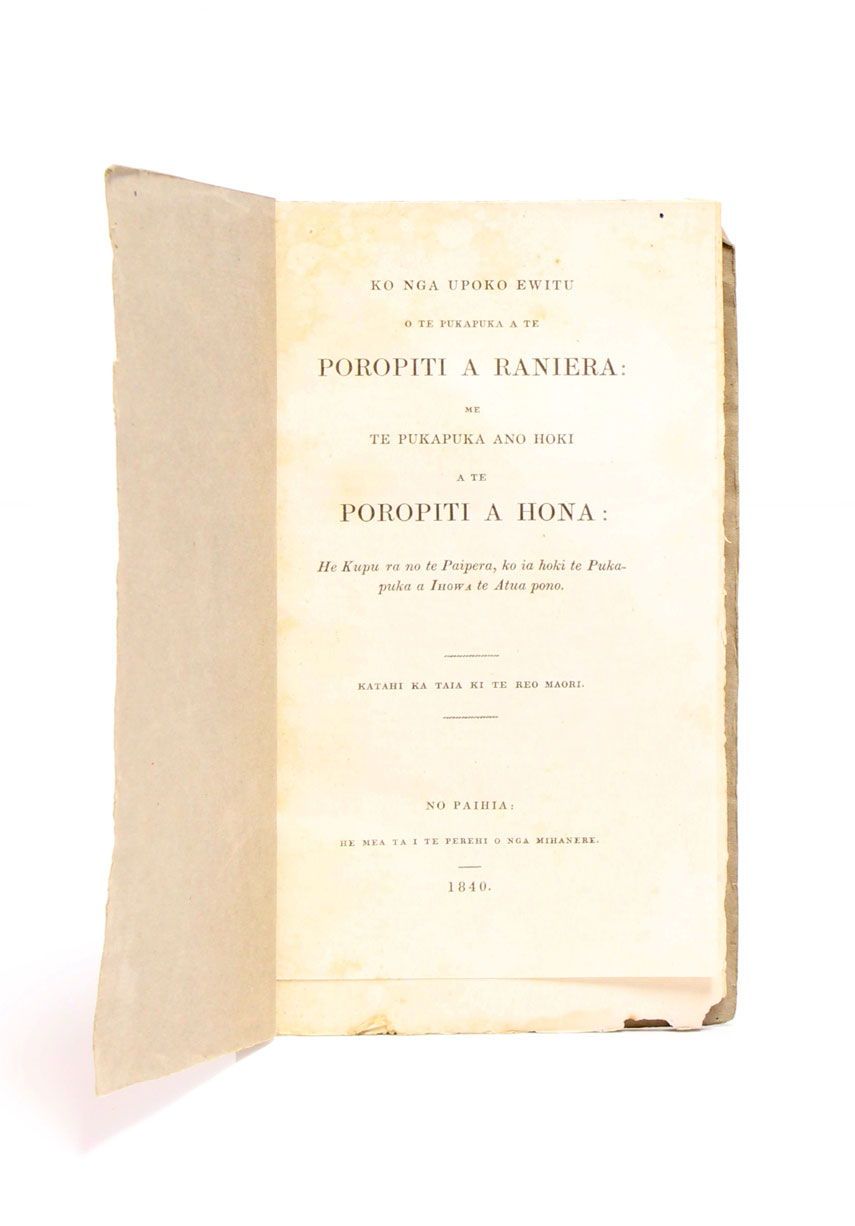 he kupu ra no te Paipera, ko ia hoki te pukapuka Ihowa te Atua Pono. Katahi ka taia ki te reo Maori. No Paihia : He mea ta i te Perehi o nga Mihanere, 1840. 8vo. 32p. 460. BIM 67. Brown paper covers. Wear and foxing. Pencil annotations on front cover. Provenance: originally from the collection of Henry Hill. First seven chapters of Daniel, and the complete text of Jonah. The second issue of Puckey's translation as revised by Colenso, with Colenso's translation of the seventh chapter of Daniel added. G. -