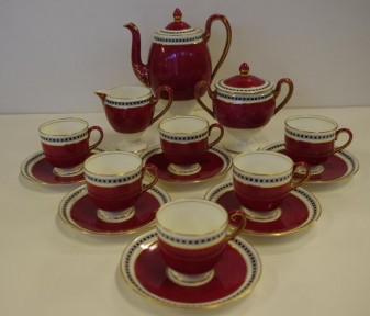 sold by Hardy Brothers Ltd, to include coffee pot, lidded sugar and creamer, together with 6 demitasse cups and saucers