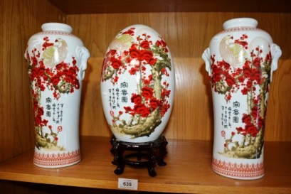 comprising of central egg shaped ornament on wooden stand flanked by a pair of vases, each piece with a bird & floral decorations & characters etc, 33cm H -