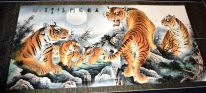 Lot Description:Chinese painted scroll with a family of tigers