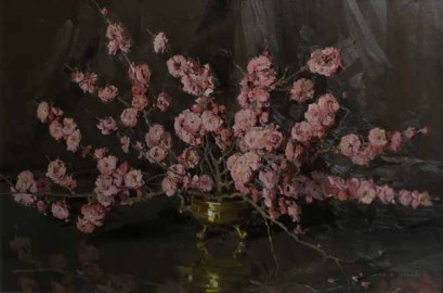signed 'ALAN D. BAKER' lower right signed and inscribed 'FLOWERING APRICOT / ALAN D BAKER' on verso -