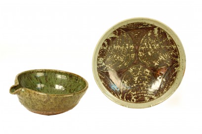 scoria containing clay body with strong dark speckling to the khaki green glaze, c.1970s. Diameter 285, height 126. -