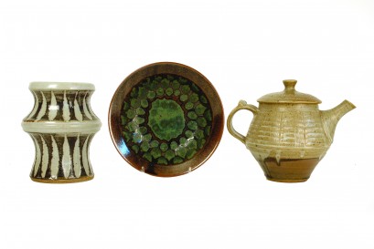 Lot Description:Peter Stichbury stoneware teapot and six wine cups