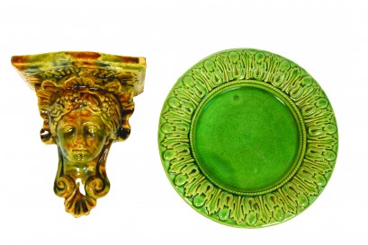 green glazed, circular form with plain centre, wide stiff leaf design with rope twist border, impressed maker’s mark, c.1880. Diameter 235. -