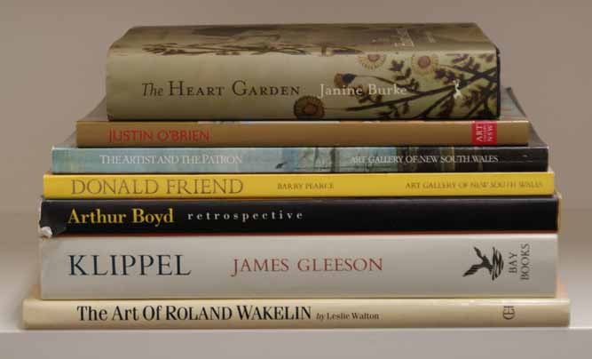 large quarto. col & b/w ills. preliminary foxing. ocb. foxing to illus d/w. Bay Books. 1983. with Pearce. B. Arthur Boyd Retrospective. quarto. signed by the artist on the title page. col & b/w plates. ocb. illus d/w marked and torn. page edges of preliminaries discoloured. Beagle Press in conjunction with AGNSW. 1993. with Pearce. B. Donald Friend 1915-1989. Retrospective. quarto. col & b/w ills. softcover. AGNSW. 1990. with Burke. J. The Heart Garden: Sunday Reed and Heide. octavo. col & b/w ills. opb. illus d/w discoloured. Knopf. 2004. with Walton. L. The Art of Roland Wakelin. tall quarto. introduction by Lloyd Rees. col plates. opb. illus d/w sunned. Craftsman House. 1987. with Pearce. B. and Wilson. N. Justin O'Brien: The Sacred Music of Colour. quarto. col & b/w ills. softcover. AGNSW. 2010. with McDonald. P. R. and Pearce. B. The Artist and the Patron: Aspects of Colonial Art in NSW. quarto. col & b/w ills. softcover. AGNSW. 1988. (7). -
