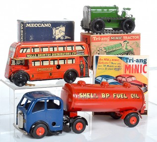 With Red Plastic Hubs & Key; Unboxed Wells-Brimtoy 'Pocketoy' Double Decker Bus With Key; Minic Tractor/Bulldozer Boxed With Key, Good Rubber Tracks (Mechanism Overwound) With Tri-Ang Minic Foldout Brochure; And Meccano 'Magic Motor' Complete With Key, Bands, Pulley And Instructions (Boxed) (VG Boxes G) (4) -