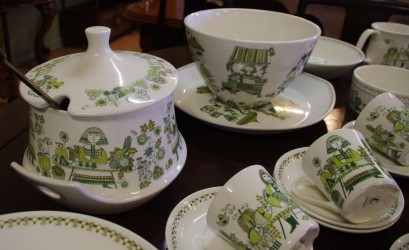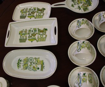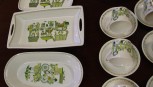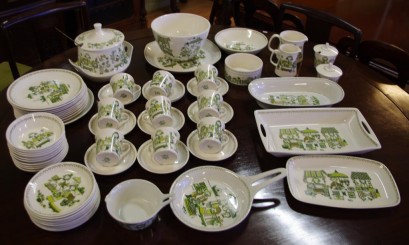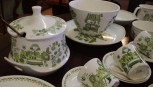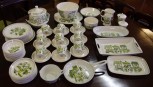 Market pattern, including 10 dinner plates, serving plate, 10 side plates, 10 soup bowls, soup tureen, large bowl, platter, 9 coffee cups with 10 saucers, milk jug,sugar bowl, lidded bowl, jug, 3 serving dishes, sauce boat, serving pan & 2 serving bowls approx. 64 pieces -