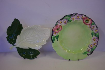 being a leaf form 26.5cm wide and another decorated with floral garland 28cm wide -