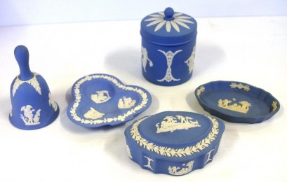 comprising of a lidded pot, bell, lidded trinket dish, together with 2 pin dishes -