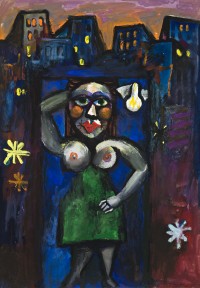 Notes:Albert Tucker’s Woman, 1950 is a painting of enormous power and invention, a fascinating work at this stage of his creative development. Having its genesis in his Images of Modern Evil spawned by the war years of Melbourne in the 1940s, Tucker responded to the traumatic upheavals of society, revealing its darker sides with the tarts of war paraded in the blackouts and primal urges, pierced by the sharp lights of night, of traffic, tram and lamp post. Moving to Europe in 1947, Tucker took this street nightlife imagery with him, representing it on the boulevards of Paris, the Seine, St Denis, or the bomb-wrecked streets of Frankfurt. He was in Paris in 1950 when Woman was painted – brazenly confrontational, heralding other such masterly works to come – The Old Eve, 1951 (National Gallery of Australia, Canberra), and Girl, 1951 (Art Gallery of Ballarat, Victoria). While the influence of the modernist Jean Dubuffet is so apparent in these two paintings, Woman provides a fascinating insight into his work just prior to the Dubuffet onslaught of emotional savagery and kindred technique intertwined. Works close to Woman, 1950 such as Macro of Place Pigalle, 1949 (National Gallery of Victoria, Melbourne) and Man with Flower, 1950 (The British Museum, London) reveal the earlier, vital influence of Picasso, first touched by art brut. Tucker loved Paris and, no matter their subjects, something of its joys and character spills over into these paintings. ‘In a Paris cafe, you could sit there all day, amongst people whom you felt rapport and sympathy with, you could be amongst all that but you were never interfered with. It was a glimpse of civilised life for me.’1 The power of Woman, 1950 owes much to its confronting imagery and colour. The direct look is taken up by bare-bosomed frontalism and the visually rhetorical repetition of forms – unmoving almond eyes, rouged cheeks, scarlet lips of entrapment, bosoms bold, the bare light bulb a metaphor of starkness, light cruel and unforgiving. The femme fatale has become the Medusa of the streets, her look enough to turn any who catch her eyes into stone. The arms manipulative and snaring in their proposed embrace, the enticing doorway encaging the figure. (When exhibited in 1978, it was titled Woman in Door, an emphasis likewise found in the preliminary drawing.) Primary colours take up the heart beat as the passion of the night reflects in the skies above buildings angular, rising vertically from which chrome yellows stare out of darkness like some wild beasts of the jungle speaking of the animalism of it all. The beauty of Paris, the city of love may be prostituted, but its star-like flowers hint at beauty. 1. Albert Tucker quoted in Burke, J., Australian Gothic: A life of Albert Tucker, Knopf, Random House Australia, Sydney, 2002, p. 302 DAVID THOMAS