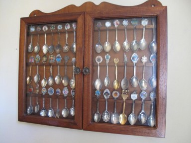 Lot Description:Two door display cabinet with collection of spoons