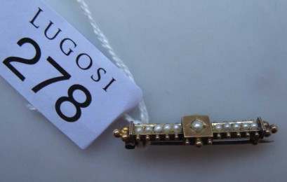 Lot #278 - Antique 9ct gold seed pearl set bar brooch
