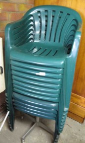 Lot Description:Twelve green stackable plastic chairs